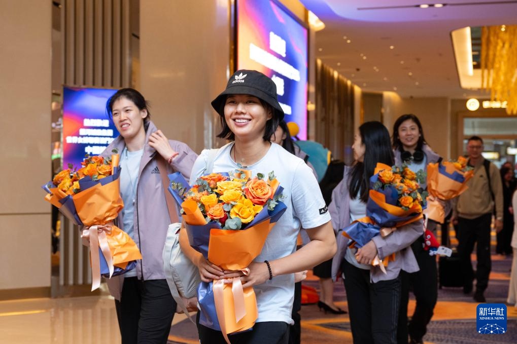5月21日,中国女排队员龚翔宇(左二)、李盈莹(左一)在欢迎仪式上。新华社记者 张金加 摄