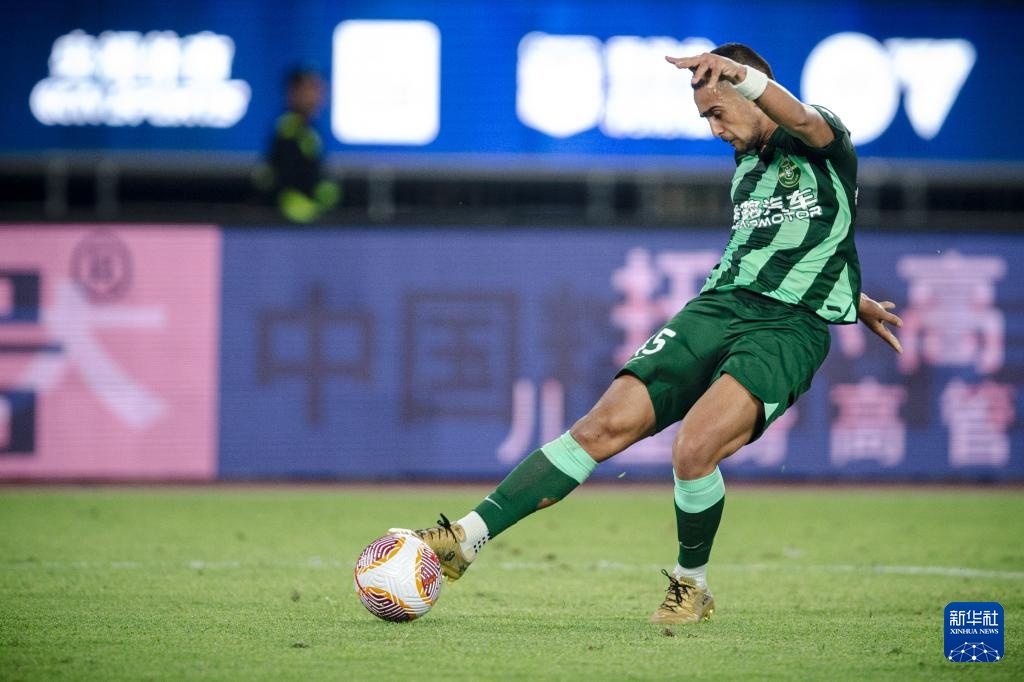 5月21日,浙江队球员莱昂纳多在比赛中射门。新华社记者 江汉 摄