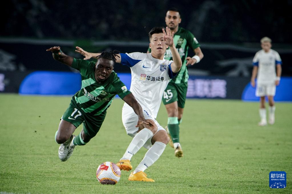 5月21日,浙江队球员埃弗拉(左)在比赛中拼抢。新华社记者 江汉 摄