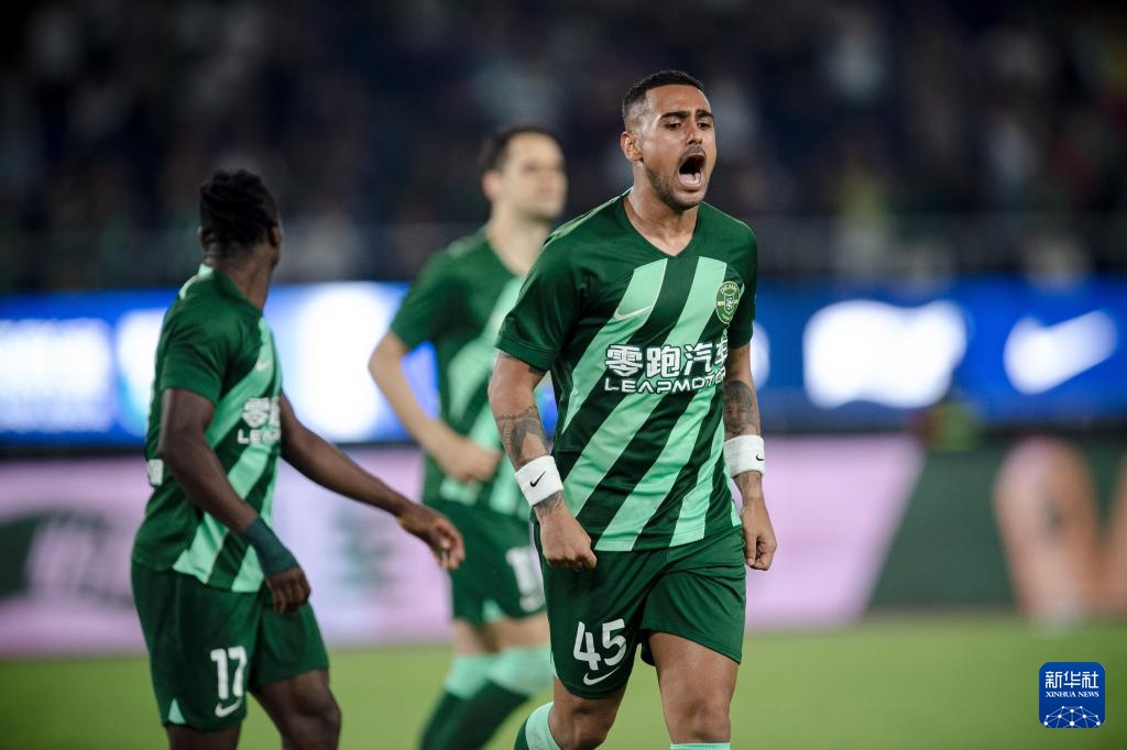 5月21日,浙江队球员莱昂纳多(前)在比赛中庆祝进球。新华社记者 江汉 摄