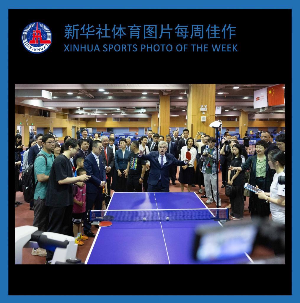 5月19日,国际奥委会主席巴赫(中)在上海体育大学中国乒乓球学院体验乒乓球机器人。
