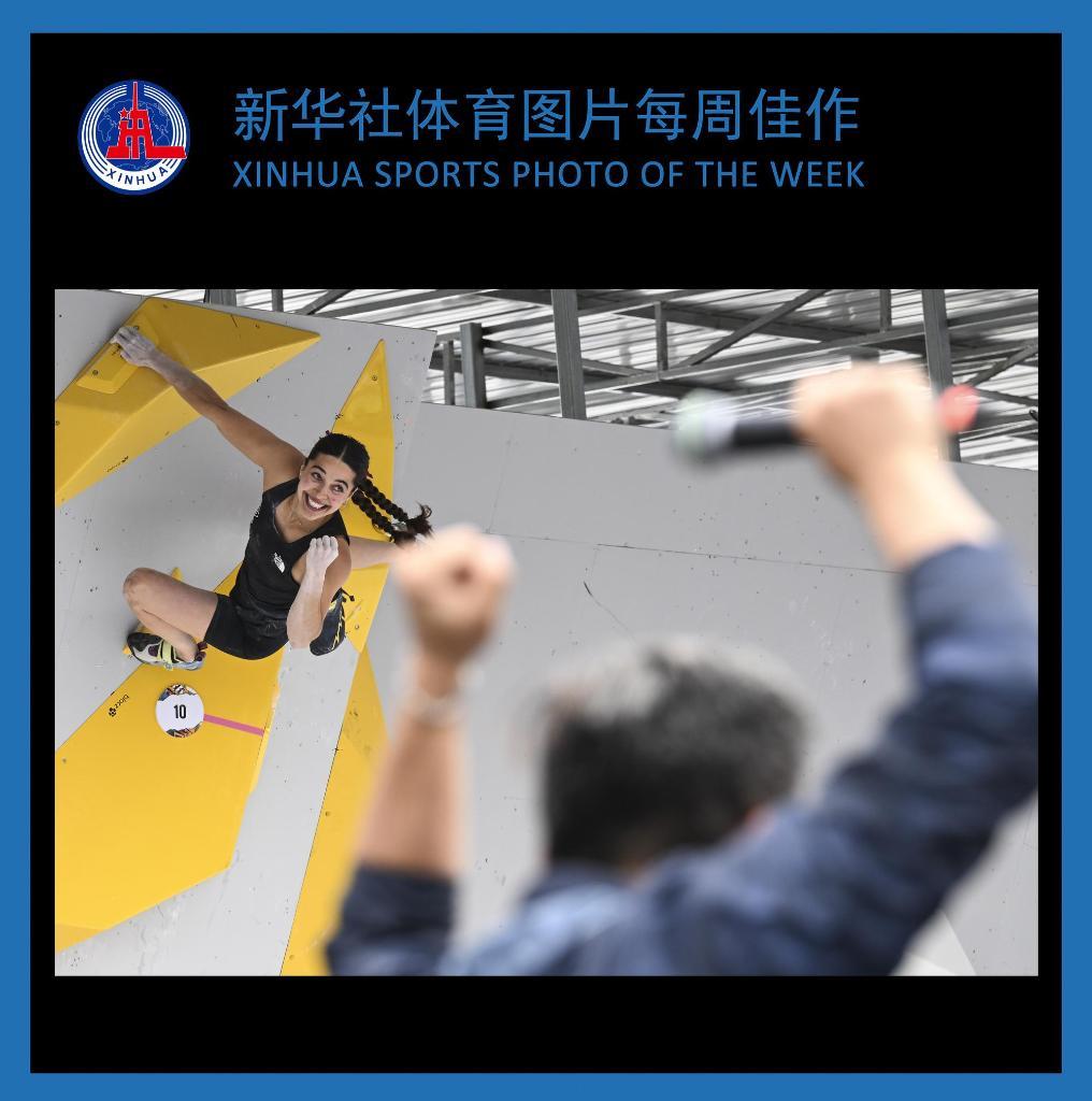 5月19日,美国选手布鲁克·拉布图在女子两项全能决赛攀石赛中庆祝。最终,她以总成绩140.9分获得冠军。