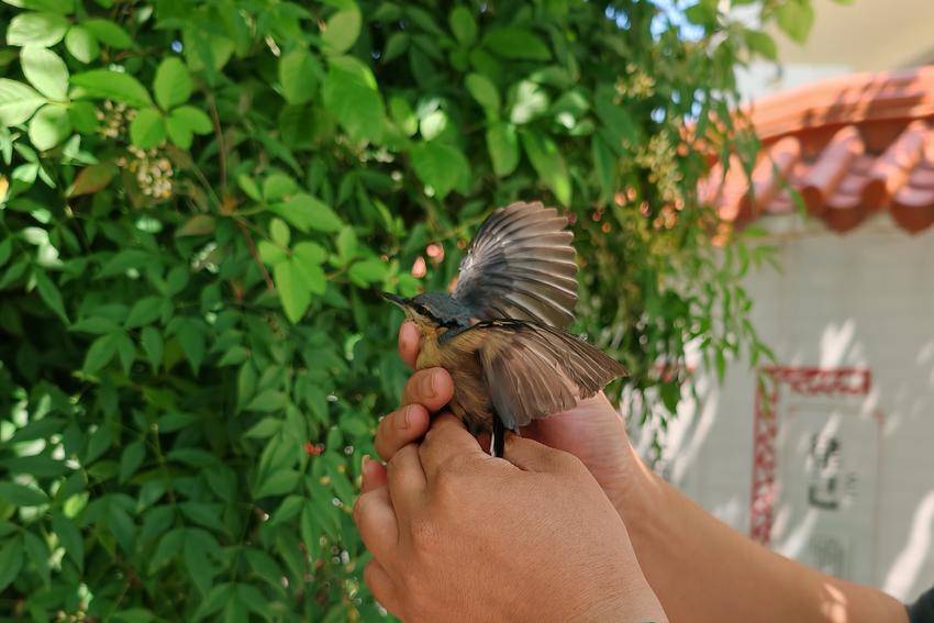 工作人员试图接近幼鸟,发现幼鸟对自己并不排斥,于是用双手将幼鸟轻轻地捧起,并送回鸟妈妈身边。