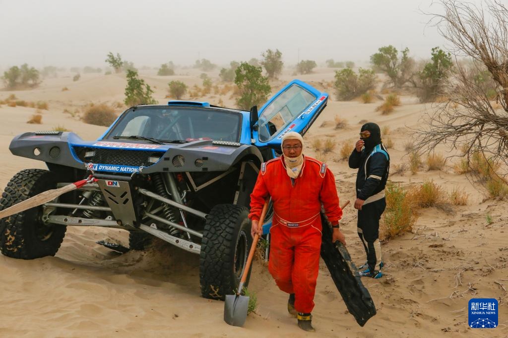5月23日,黑龙江龙嘉先越拉力艺车队车手张德金、领航员陈庆开在比赛中陷车,陈庆开在车外指导赛车倒车脱困。新华社记者 陈朔 摄