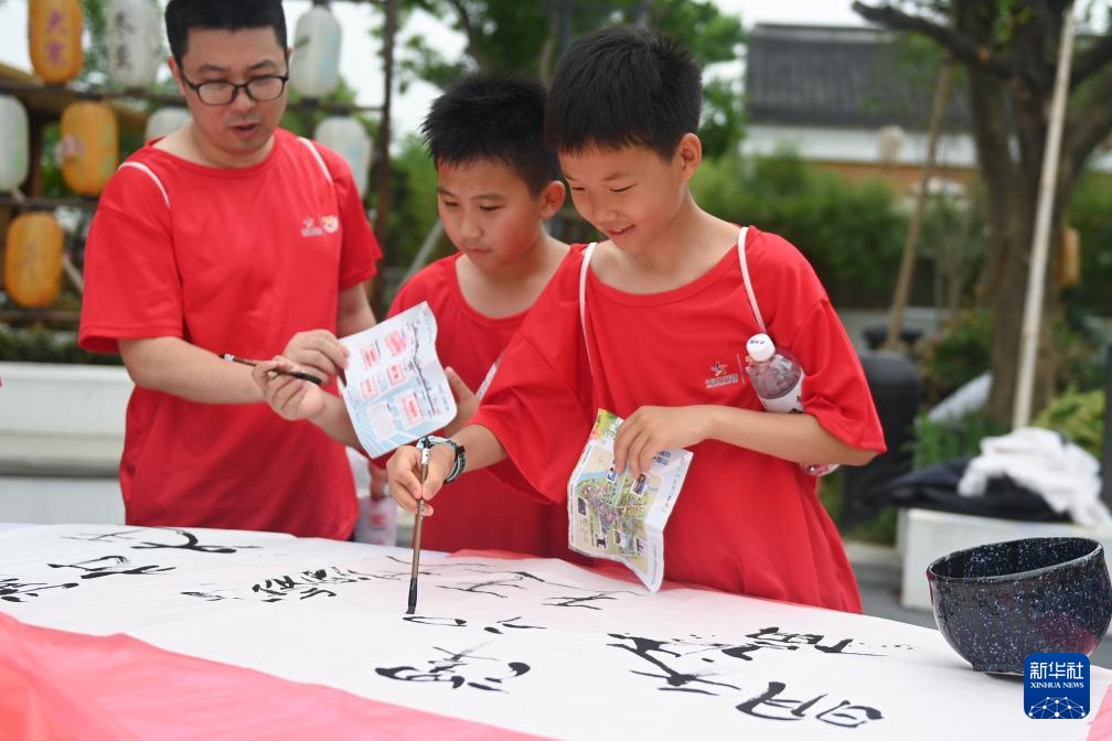 5月25日,参加定向赛的小朋友在比赛中完成写毛笔字的体验项目。新华社记者 黄宗治 摄