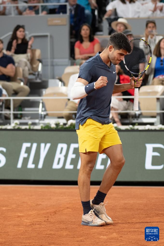 5月26日,阿尔卡拉斯在比赛后庆祝胜利。新华社记者 孟鼎博 摄