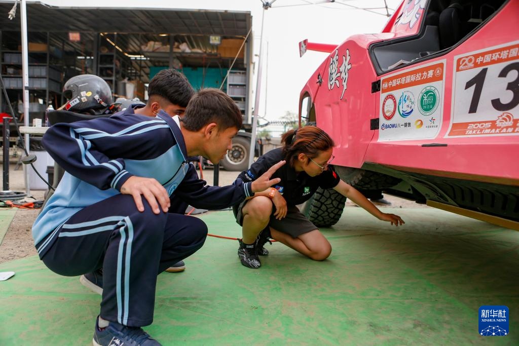 5月27日,陕西云翔俱乐部技师在和田洛浦大营检修车辆。新华社记者 陈朔 摄