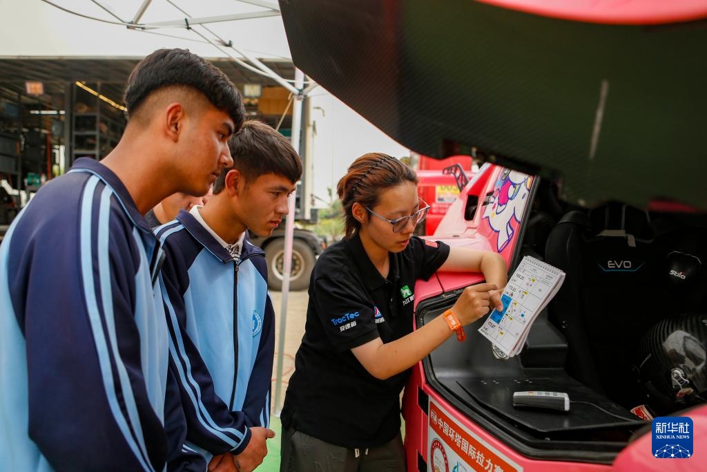 5月27日,河北迁安九江汽摩运动俱乐部领航员马欣(右)在和田洛浦大营为新疆和田洛浦县中等职业学校学生介绍赛车。新华社记者 陈朔 摄