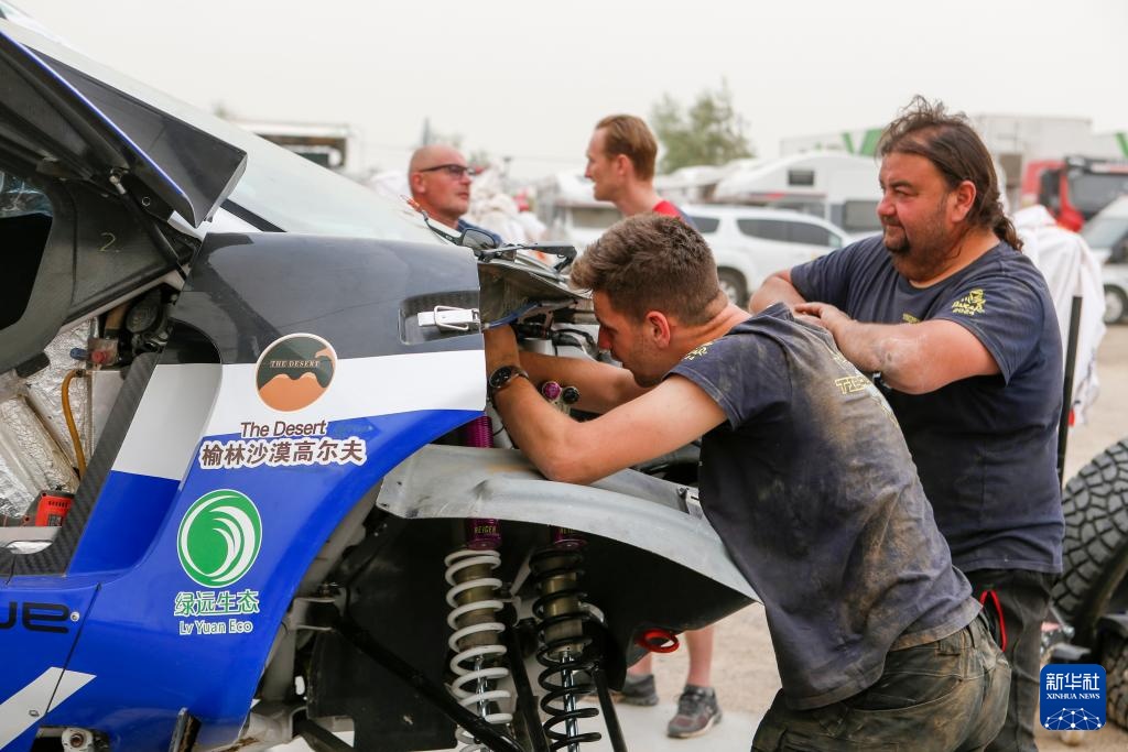 5月27日,陕西云翔汽摩运动有限公司技师在和田洛浦大营检修车辆。新华社记者 陈朔 摄