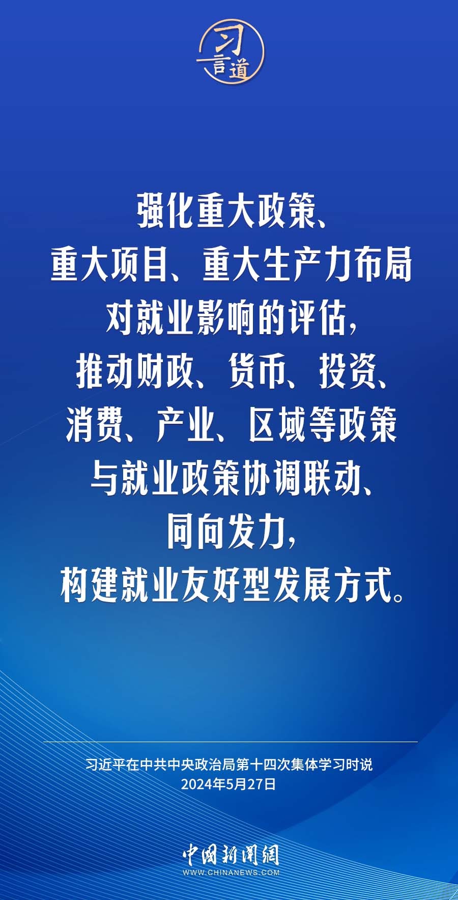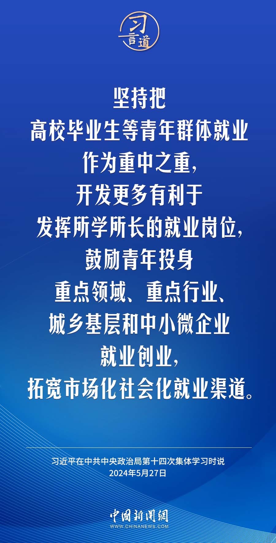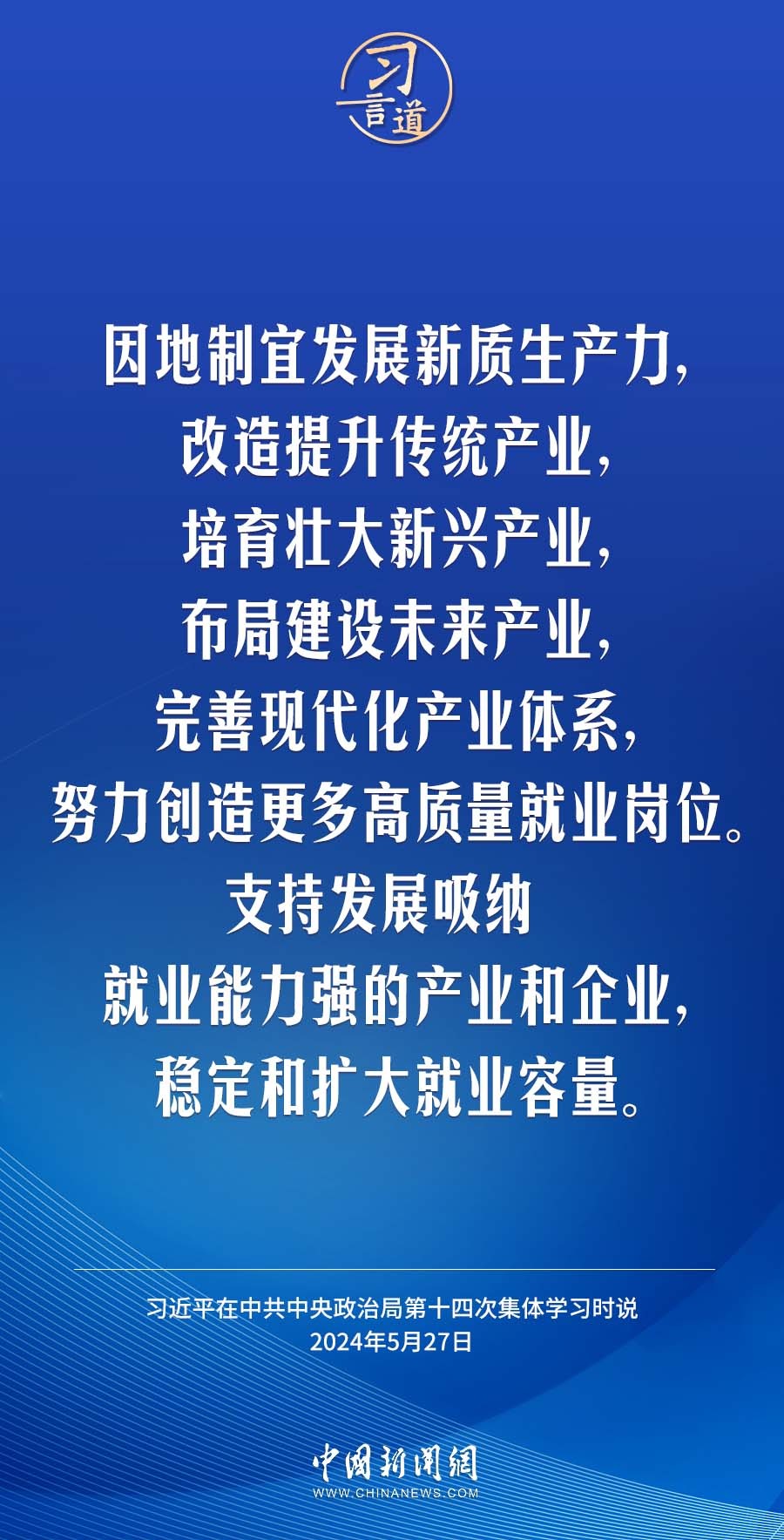 中共中央政治局5月27日下午就促进高质量充分就业进行第十四次集体学习。中共中央总书记习近平在主持学习时强调——