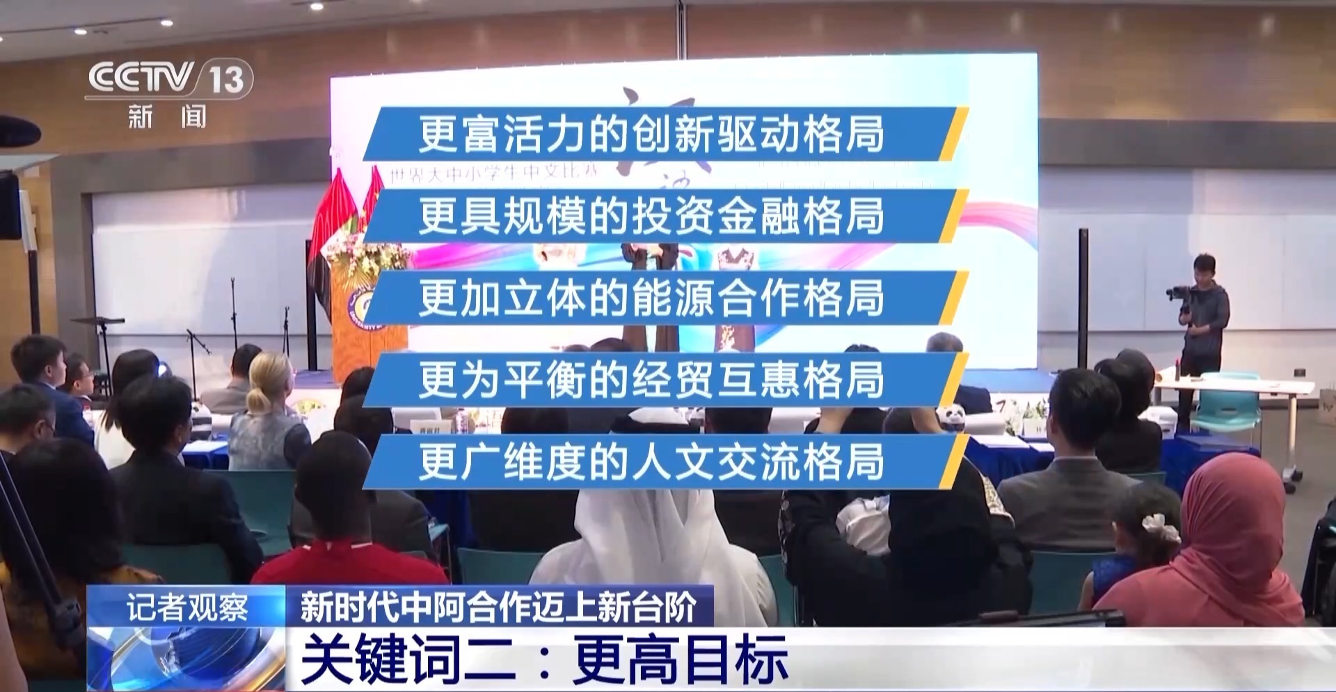 宁夏大学中国阿拉伯国家研究院执行院长 牛新春:自从“八大共同行动”提出来之后,在过去两年的时间里,“八大共同行动”里的很多措施都得到了落实。“五大合作格局”是对“八大共同行动”的发展和升级。除了传统的双方的贸易、能源、基础建设和人文交流这些领域之外,进一步提出了在创新领域、新能源领域,在全球文明倡议的领域,中国和阿拉伯国家未来会在更高层次上进行合作,也会在新的领域投入更多的精力和时间,也标志着中阿关系会在未来几年得到更大的发展。