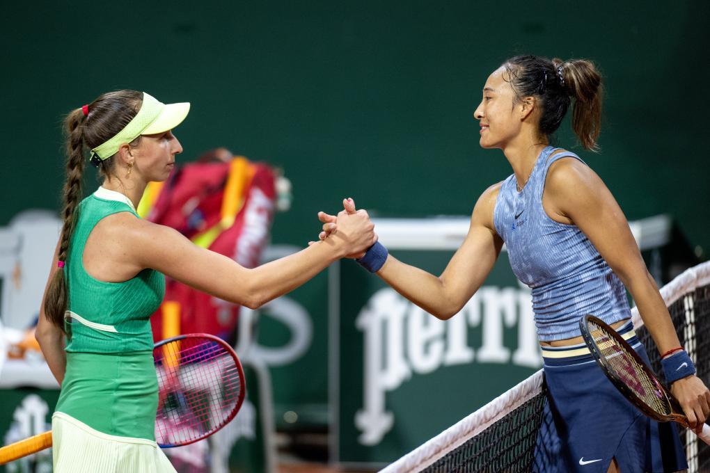 5月30日,郑钦文(右)在比赛后与科尔帕奇握手。新华社记者 孟鼎博 摄