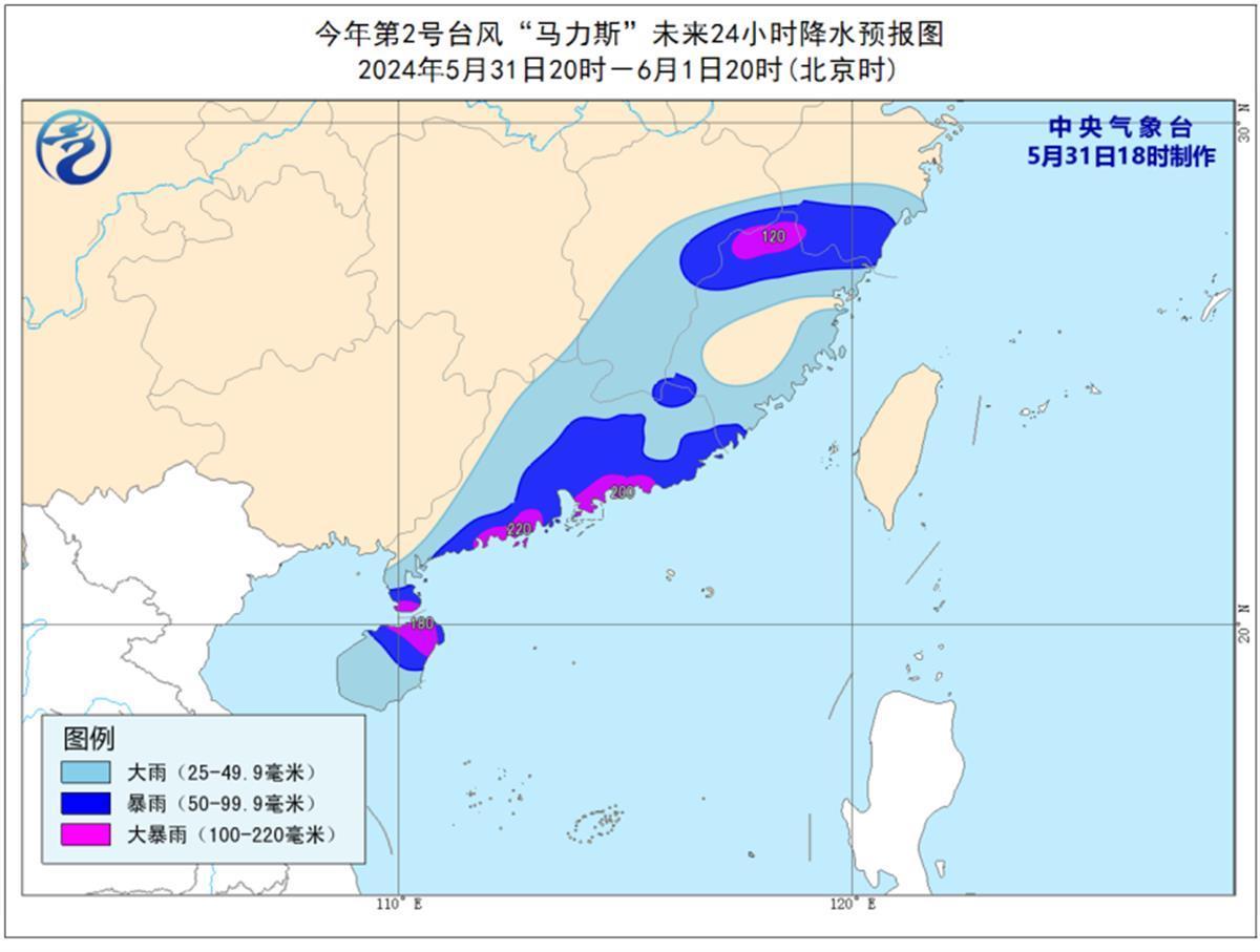 降水预报:5月31日20时至6月1日20时,广东、海南岛及西沙群岛、福建大部、江西南部和东部、浙江南部等地有大到暴雨,其中,广东南部沿海、海南岛东北部、福建西北部等地部分地区有大暴雨(100-220毫米)。