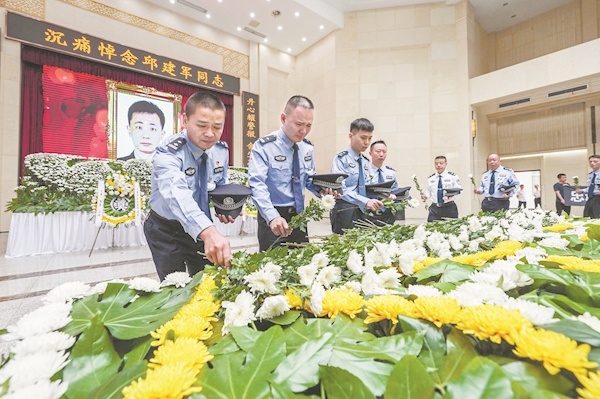 楚天都市报极目新闻讯(记者吴昌华 通讯员武龚萱)丹心耀警服,舍生忘死保民安;热血铸忠诚,千山垂泪挽英雄。6月3日上午,湖北省武汉市汉口殡仪馆告别大厅内,挽联高悬、花圈绕护、哀乐低回。武汉市公安局江汉区分局汉兴派出所副所长邱建军同志的遗体告别仪式在这里举行。邱建军同志的遗属、生前亲友、同事及各界群众代表数百人参加仪式。他们强忍悲痛,含泪送别英雄最后一程。