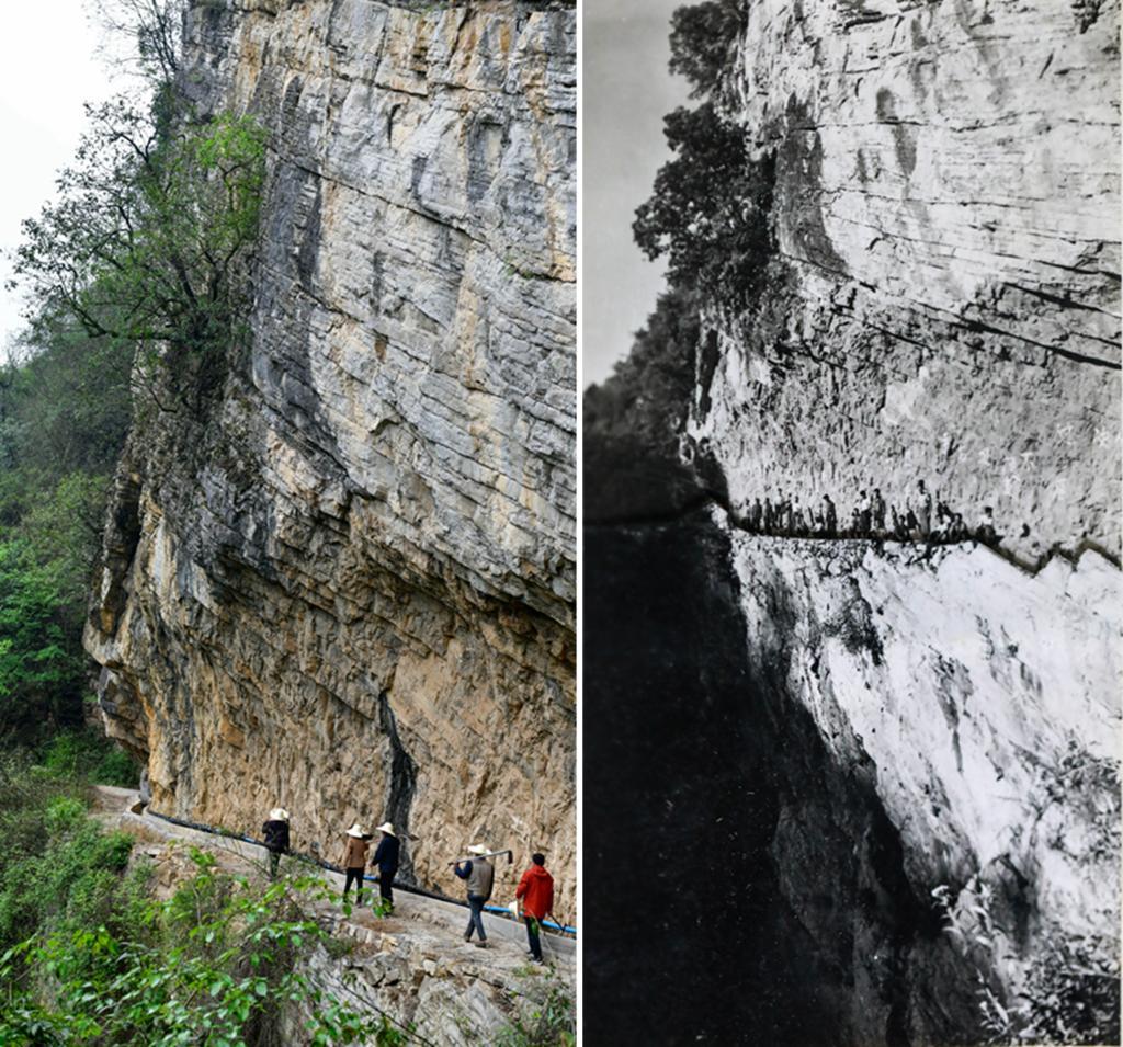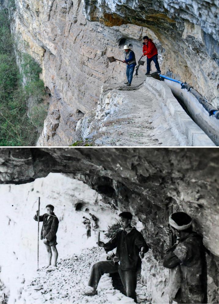 拼版照片:左图为2024年4月24日,护渠队员在生机镇巡护高流天渠;下图为1960年,村民在七星关区生机镇修凿高流天渠时的情景(王振翔摄)。