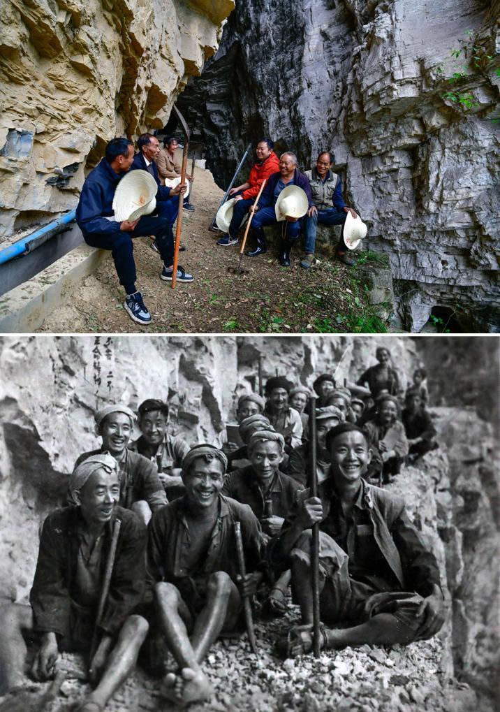 拼版照片:上图为2024年4月24日,护渠队员在生机镇高流天渠清理渠道;下图为1960年,村民在七星关区生机镇修凿高流天渠时的情景(王振翔摄)。