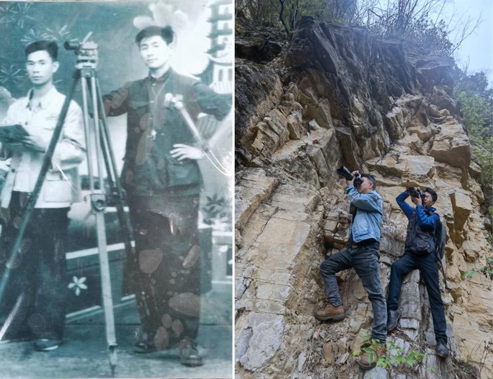 拼版照片:左图为水利技术员徐荣(右)与修渠队员的合影(资料照片);右图为2024年4月24日,新华社记者杨文斌(左)与新华社签约摄影师王纯亮在拍摄绝壁天渠(潘希来摄)。