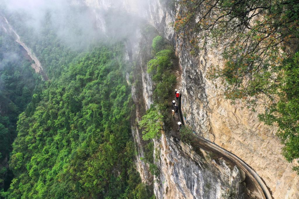 这里,是贵州省毕节市七星关区生机镇的绝壁天渠巡护现场。此次采访,是为了寻访当年村民和水利勘测人员在悬崖绝壁间排除万难、劈山凿渠的故事。