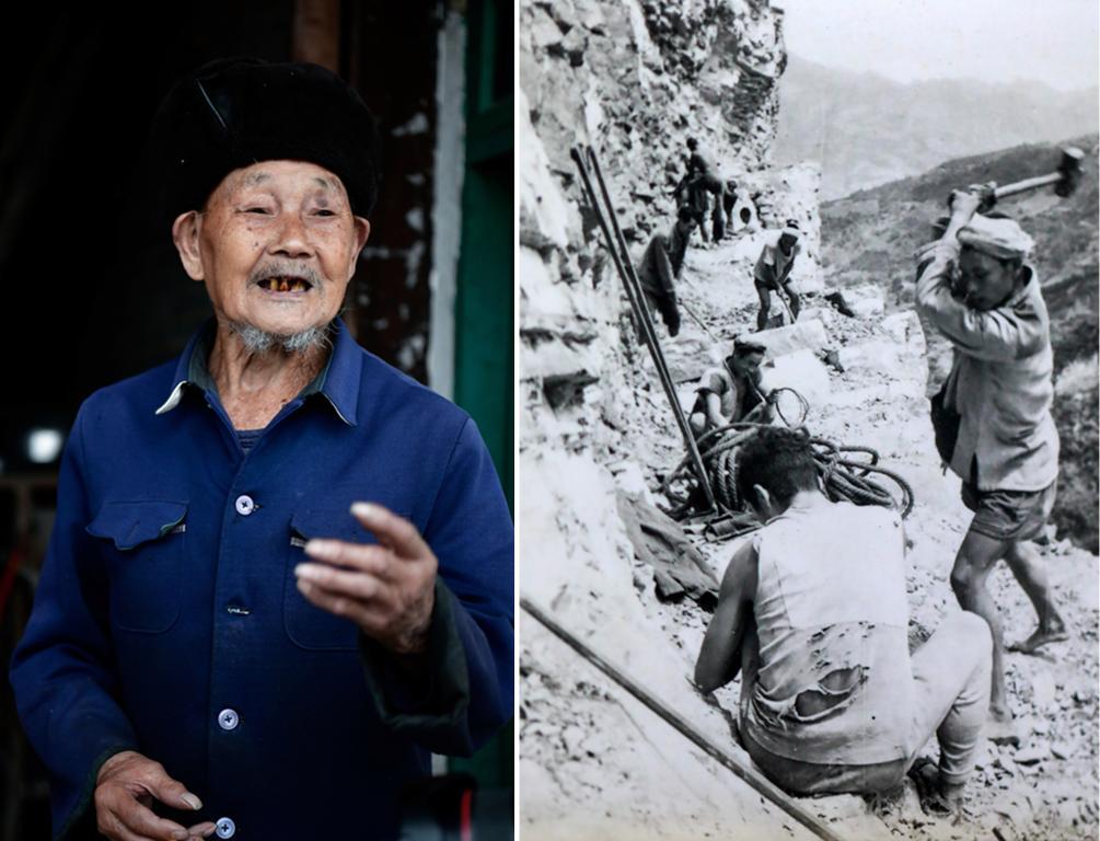 拼版照片:左图为2024年4月24日,修渠人刘新芝在介绍当年修建七星关区生机镇高流天渠的情况;右图为1960年,刘新芝(右一)与村民们在修凿七星关区生机镇高流天渠的情景(王振翔摄)。