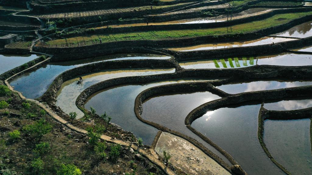 这是生机镇高流村使用绝壁天渠灌溉的稻田(4月24日摄)。