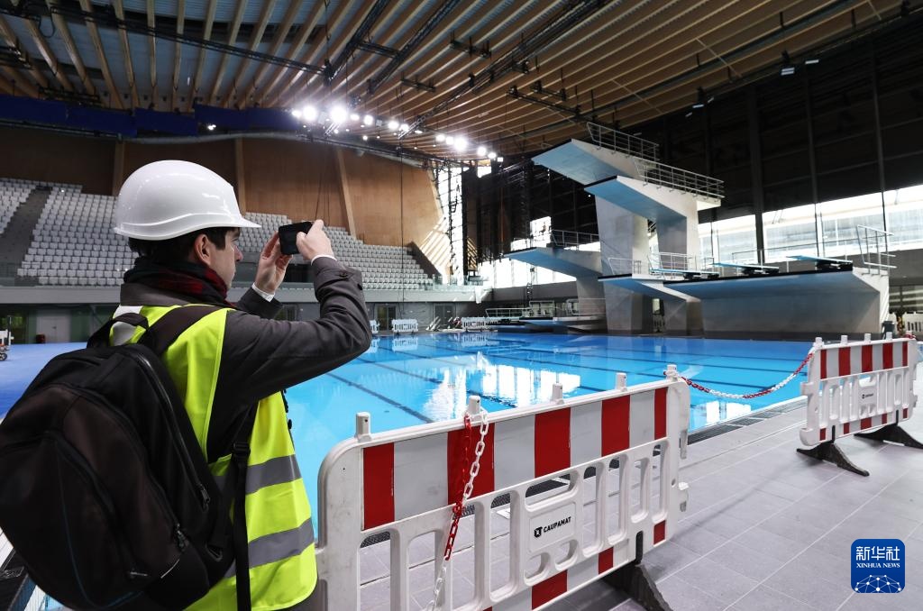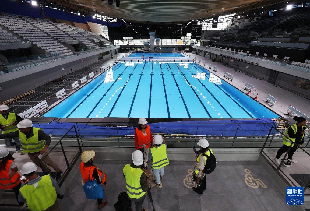 6月5日,媒体记者在巴黎奥林匹克水上运动中心采访。新华社记者 高静 摄
