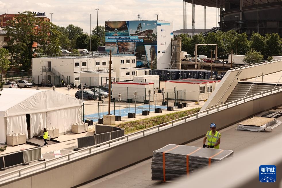 这是6月5日拍摄的巴黎奥林匹克水上运动中心尚未完工的施工现场和对面的法兰西体育场,牌子上写着“巴黎大区为您建造奥林匹克水上运动中心”。新华社记者 高静 摄