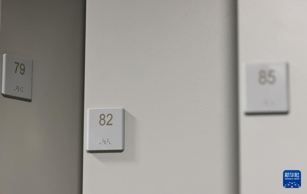 这是巴黎奥林匹克水上运动中心内储物柜上带有盲文的标签(6月5日摄)。新华社记者 高静 摄