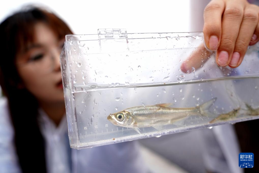6月5日,上海举行以“青春护江 生态放流”为主题的“青春长江”青年志愿服务联盟暨长江口深水航道增殖放流活动。在上海长兴横沙渔港码头,工作人员展示即将被放流的翘嘴鲌和日本沼虾。
