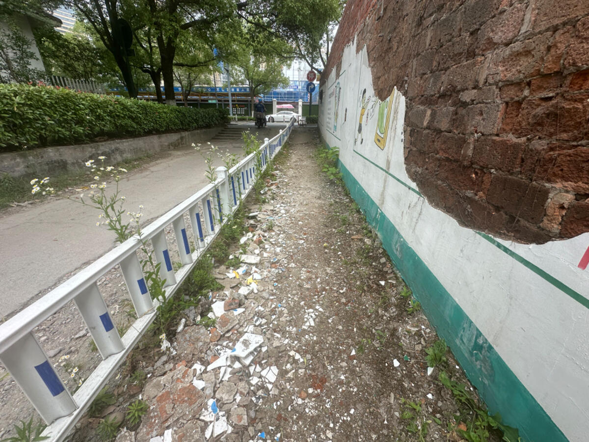 6月5日,浙江在线记者来到陆女士所反映的道路查看情况。这条路大约延伸百米左右,西端延伸为横三路,东端交接工人路。东端起始处大约有20米设置了护栏,用来隔离行人和机动车的通行。人行通道的路面上散落着围墙掉落的墙皮,步行通过时能明显感觉到路面高低不平。大约往西走100米的距离,道路逐渐变窄仅能让一辆车通过。