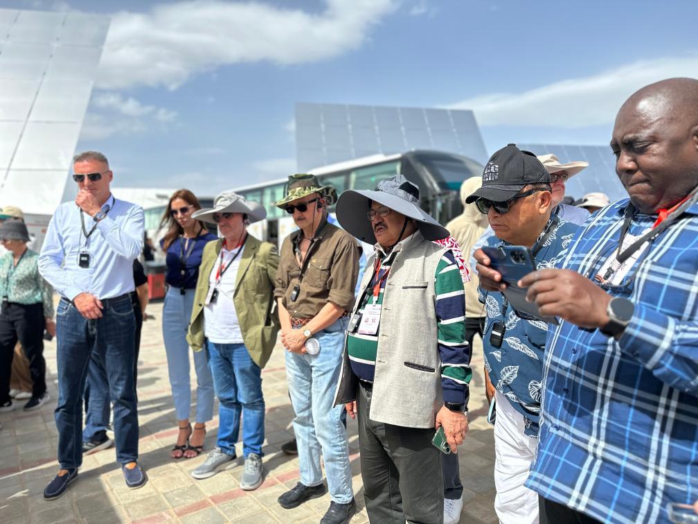 在首航高科敦煌100兆瓦熔盐塔式光热电站的吸热塔前,外交官们对中国新能源技术应用和产业发展表现出极大兴趣,一边提问,一边用手机拍摄眼前的震撼场景。
