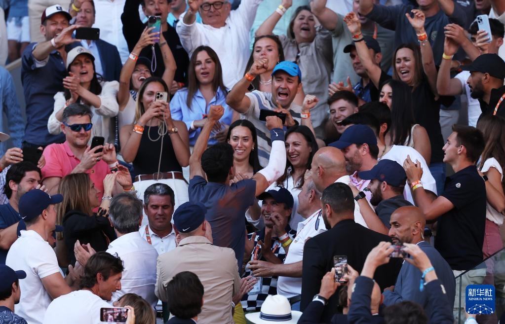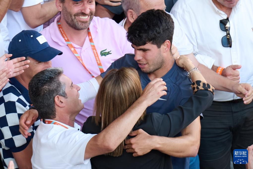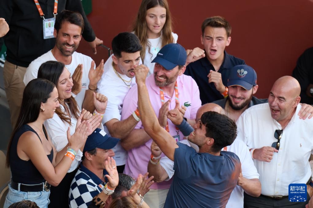 6月9日,阿尔卡拉斯(中)在比赛后庆祝胜利。