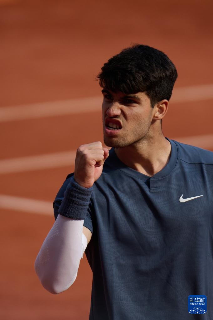 6月9日,阿尔卡拉斯在比赛中庆祝得分。