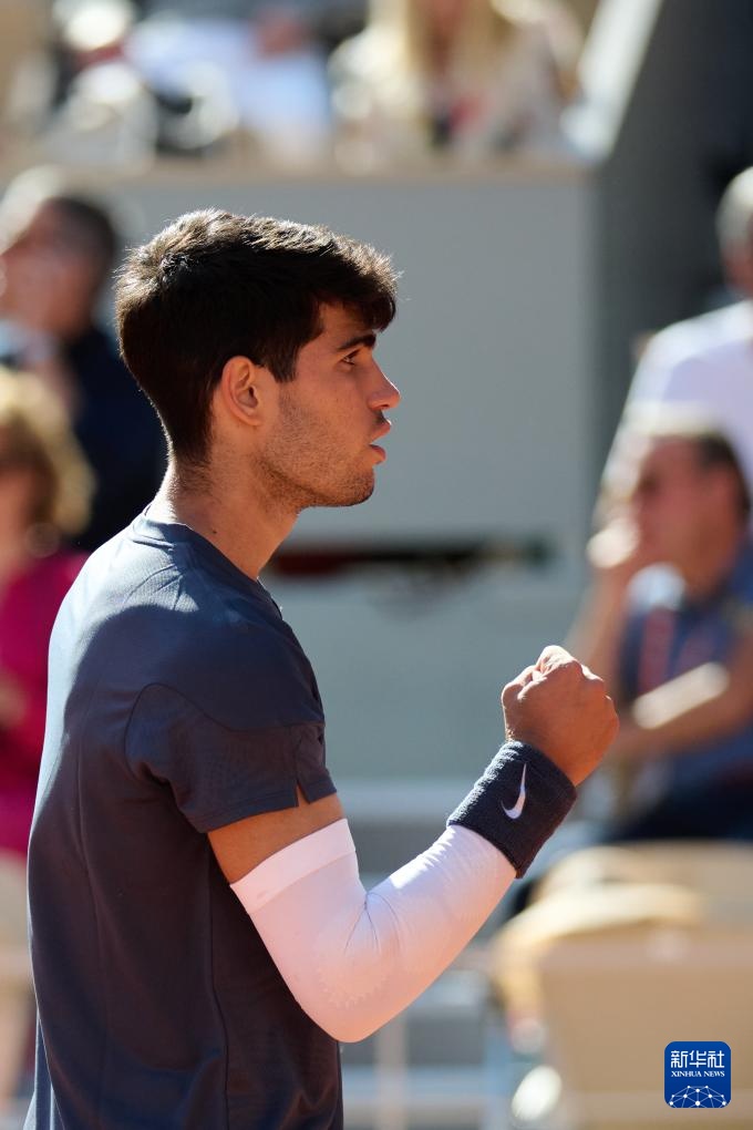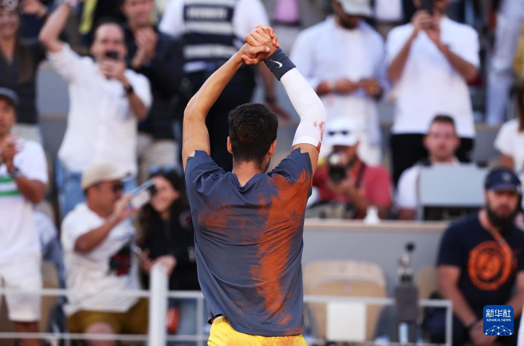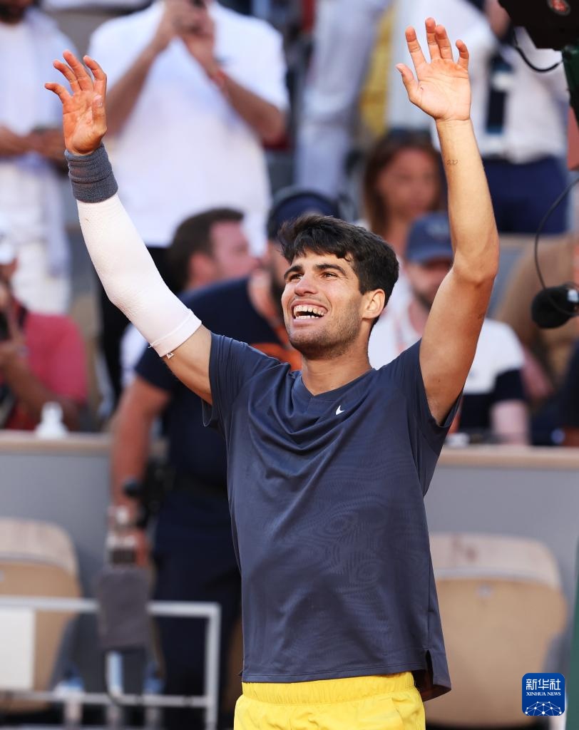 6月9日,阿尔卡拉斯在比赛后庆祝胜利。