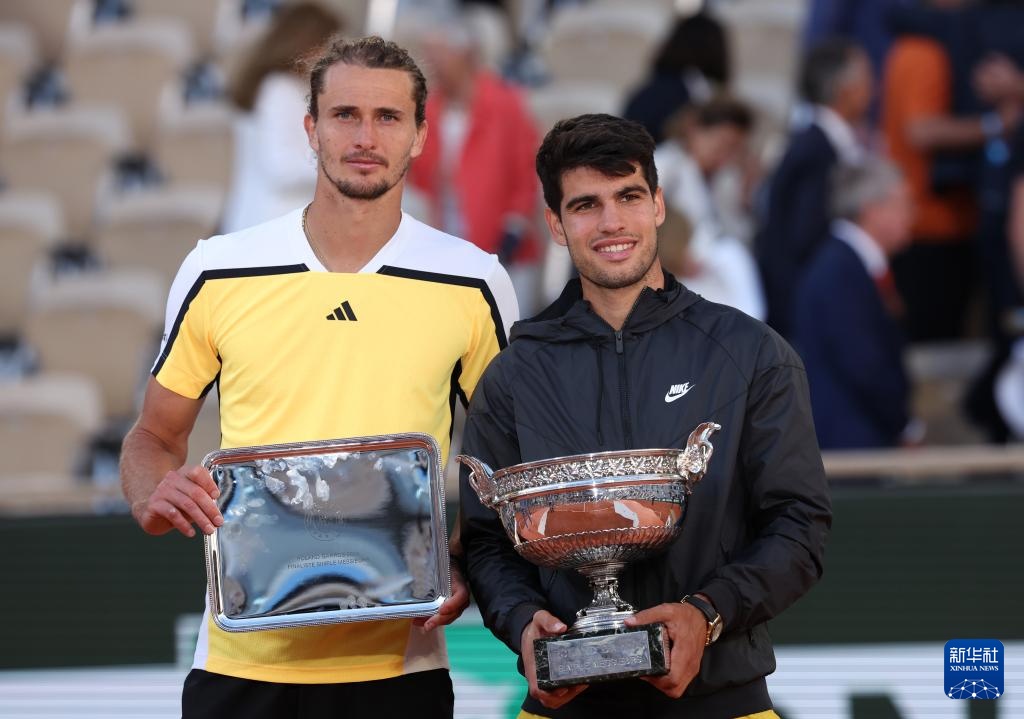 6月9日,阿尔卡拉斯(右)和兹维列夫在颁奖仪式上。