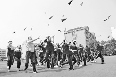 5月24日,中学生在山东潍坊高密市第五中学放飞写有高考心愿的纸飞机。李海涛摄/光明图片