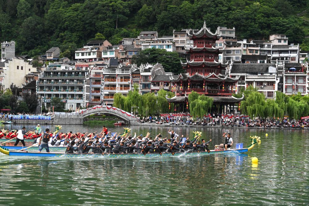 6月10日,参赛队伍在贵州省镇远县㵲阳河上进行龙舟比赛。新华社记者 杨文斌 摄