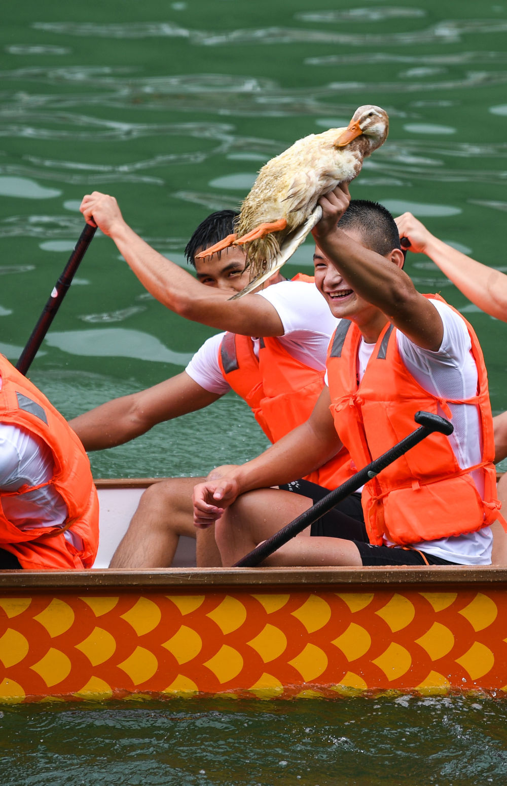 6月10日,在贵州省镇远县㵲阳河,获胜龙舟队队员展示获得的奖品。新华社记者 杨文斌 摄