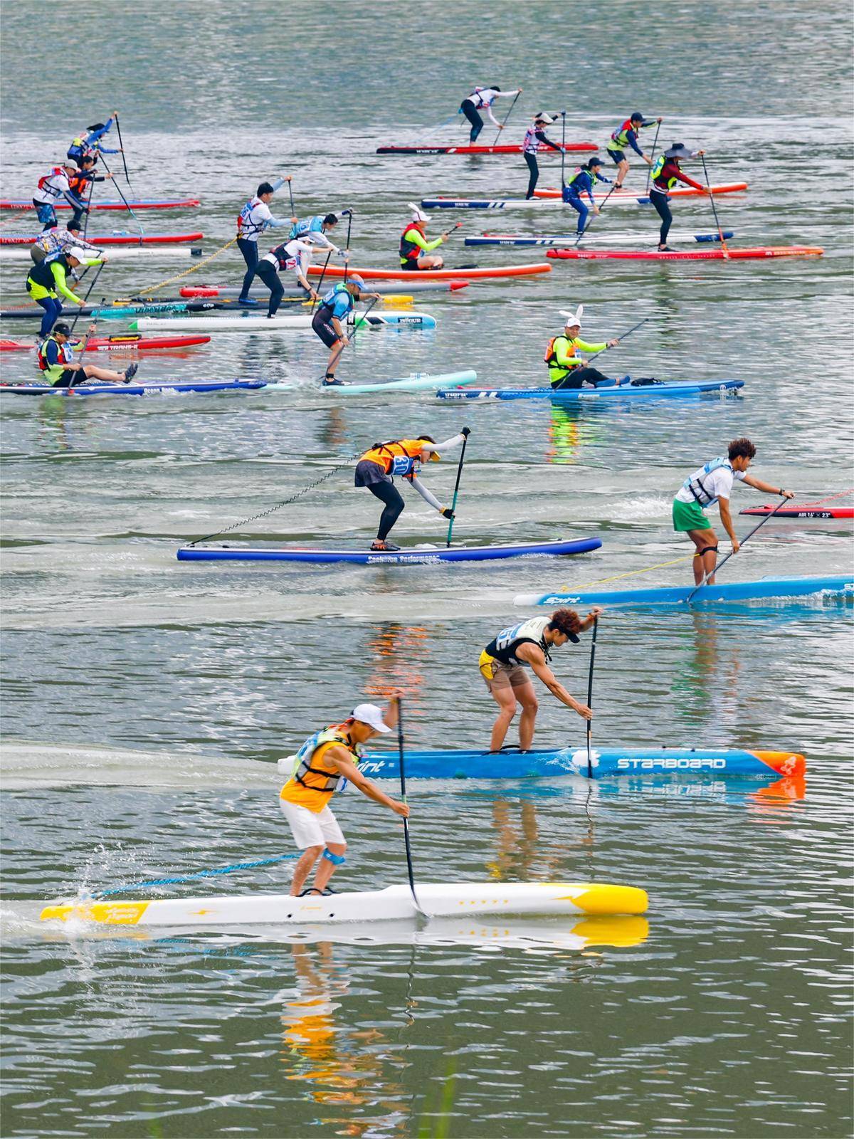 2024年6月10日端午节当天,在武汉市硚口区汉江湾桥下,桨板爱好者们脚踩长板、手摇划桨,在汉江上享受桨板乘风破浪带来的快乐。 (湖北日报全媒记者 倪娜 通讯员 高珊 韩玄飞 摄)