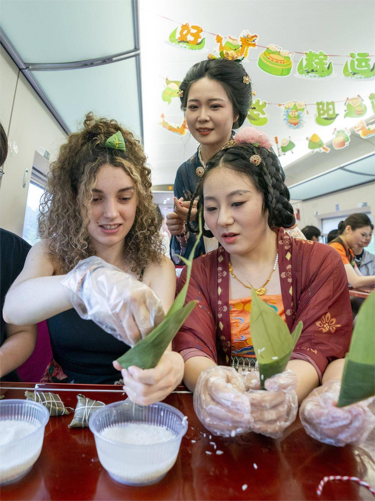 6月9日,在时速300多公里的武汉开往深圳北的G883次列车上,中外旅客和高铁乘务员一起欢乐进行“浓情端午,棕香传情”主题活动。(湖北日报全媒记者 魏铼 通讯员 孙畅 摄)