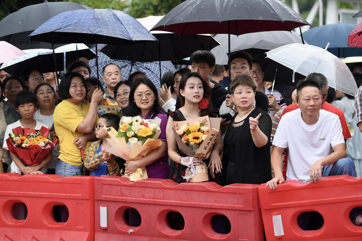 6月9日18时40分许,2024年高考咸宁鄂南高中考点,结束最后一科考试的考生冲出考点。冒雨守候在外的家长和老师用一束束鲜花表达对考生的祝福。(湖北日报全媒记者 李溪 摄)