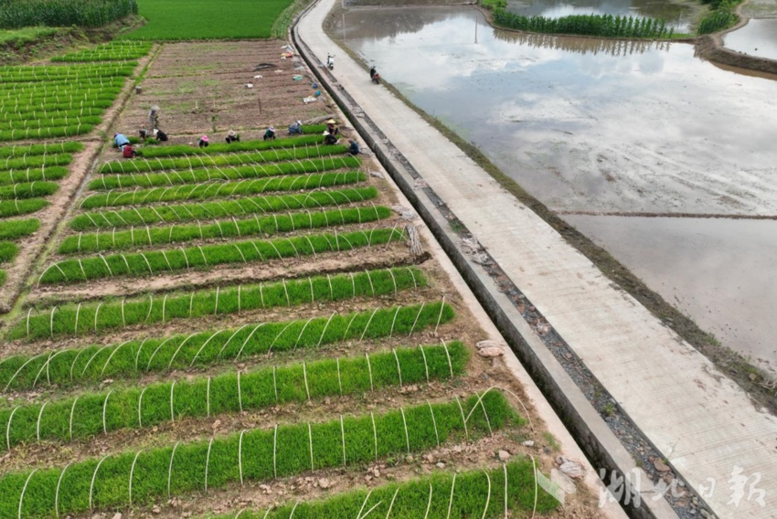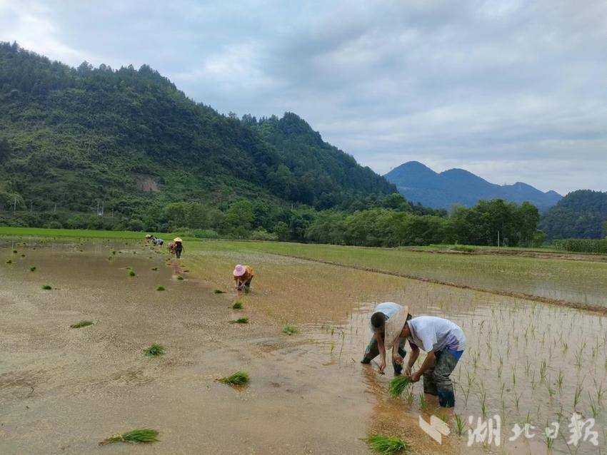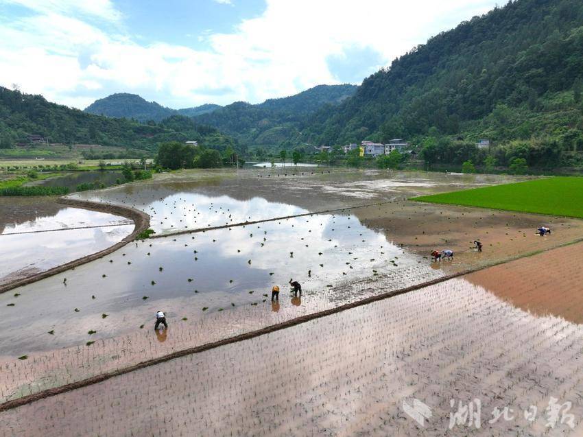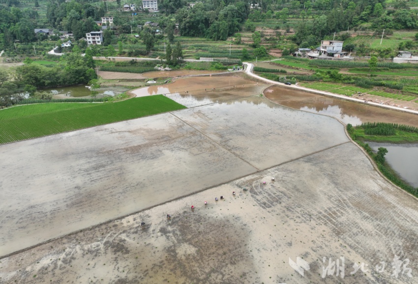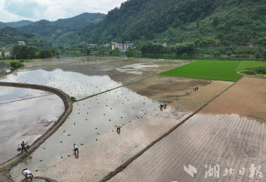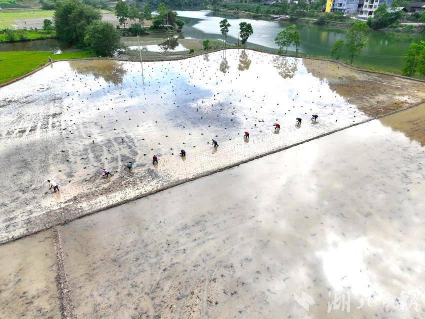 湖北日报客户端讯(通讯员黄锋)6月7日,在位于唐崖河畔的咸丰县清坪镇中寨坝村,种粮大户黄泽孝请了30多名村民在300余亩高标准农田里栽秧。村民们分工明确,七八人在苗床上扯秧苗,两三人挑秧苗,其他村民负责栽秧。村民一边栽秧,一边时不时地来两首山歌,粗犷的歌声响彻唐崖河两岸。