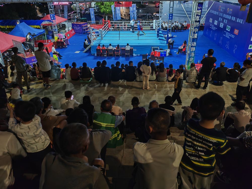 拳台上,拳套击打护具砰砰作响;看台上,队友加油和观众呐喊此起彼伏。运动员被激发出竞技热情的同时,也点燃了当地群众观看拳赛、深入了解这项运动的热情。乡贤文化公园的台阶上坐满了观众,街边人行道上也站满了驻足观赛的行人。“那种拳拳到肉的紧张感是在屏幕前完全体会不到的。”贵定县居民王毅开车路过赛场,把车停好就带着读幼儿园的儿子和妻子一起坐在台阶上看起了比赛。