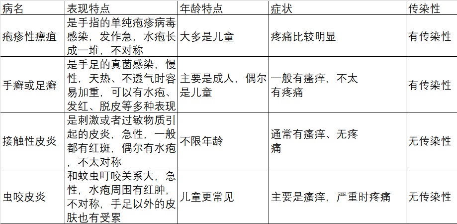 汗疱疹的特点聊完了,那么,还有哪些水疱也会长在手上或脚上?那可多了。下面表格中,就列举了几个常见的、容易误诊为汗疱疹的供大家区分。