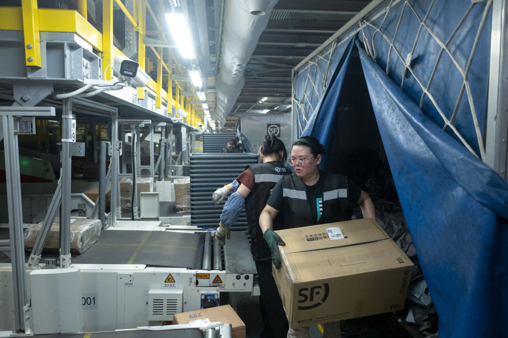 2024年5月25日凌晨,工人在湖北鄂州花湖国际机场转运中心进行分拣作业。新华社记者 肖艺九 摄
