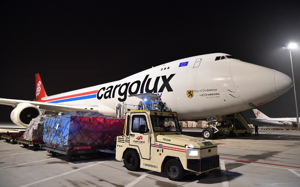 在郑州新郑国际机场,工作人员驾驶新能源拖车为一架卢森堡货航货机卸货(2023年8月1日摄)。新华社记者 李嘉南 摄
