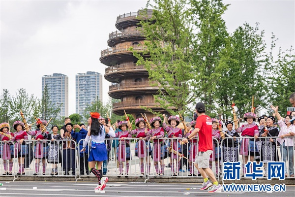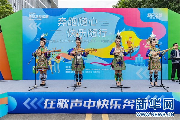 6月16日,贵阳马拉松赛沿线的一处民族歌舞展演点。新华网发(主办方供图)