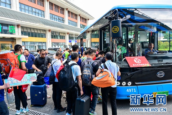 参加贵阳马拉松赛的选手在高铁站搭乘主办方安排的接驳车前往报到领取物资处。新华网发(主办方供图)