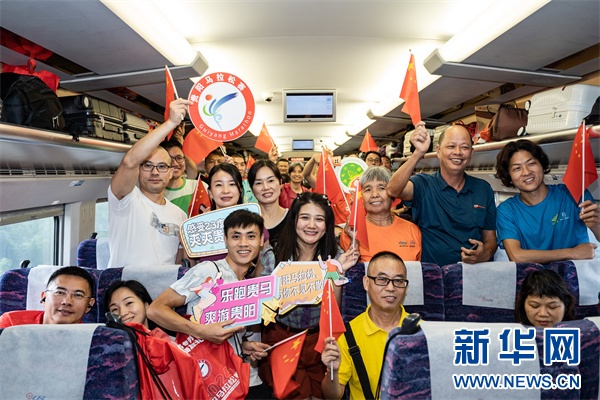 参加2024年贵阳马拉松赛的跑友们在前往贵阳的“贵马高铁专列”车厢中合影。新华网发(主办方供图)