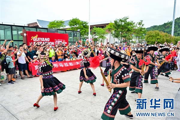 主办方在高铁东站为前来参加贵阳马拉松的选手举行富有民族特色的欢迎仪式。新华网发(主办方供图)