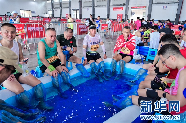 6月16日,参加完2024年贵阳马拉松赛的选手在进行赛后恢复。新华网发(主办方供图)